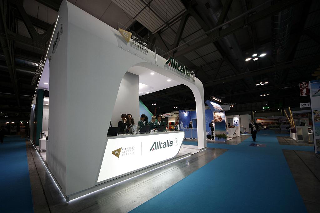 The 140sqm stand in Hall 14 was notable for its innovative design. The structure was comprised of a large, all-encompassing curved ceiling, two Alitalia towering helms and a large LED screen; the latter was the set for the press conference of the Alitalia’s Chief Operating Officer Ariodante Valeri who outlined Alitalia’s future plans, the company’s partnership with Etihad and who spoke of the forthcoming EXPO 2015 during which Alitalia and Etihad Airways would be the Official Global Airline Carrier .