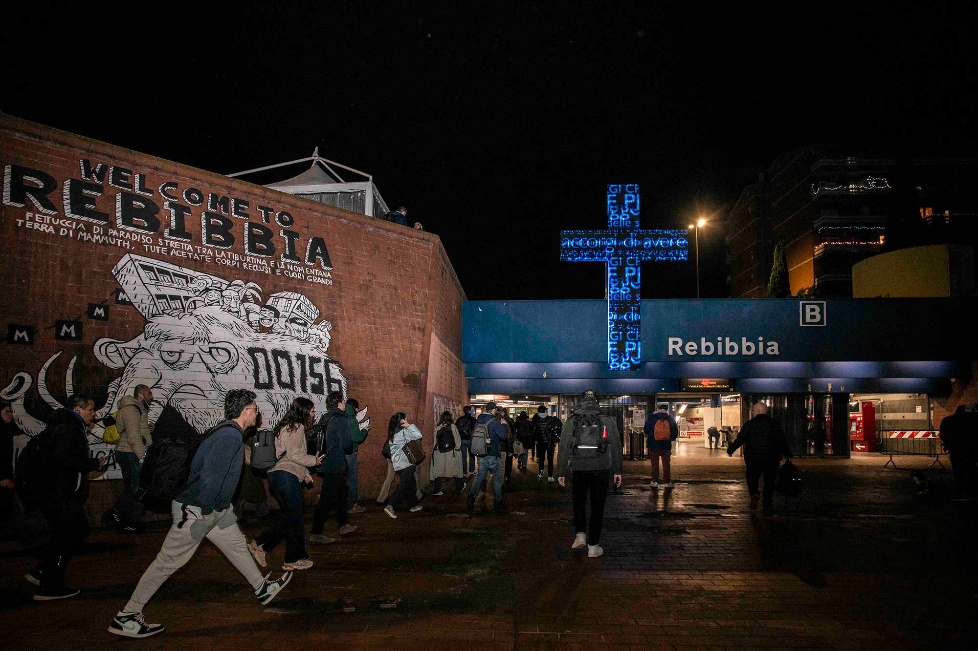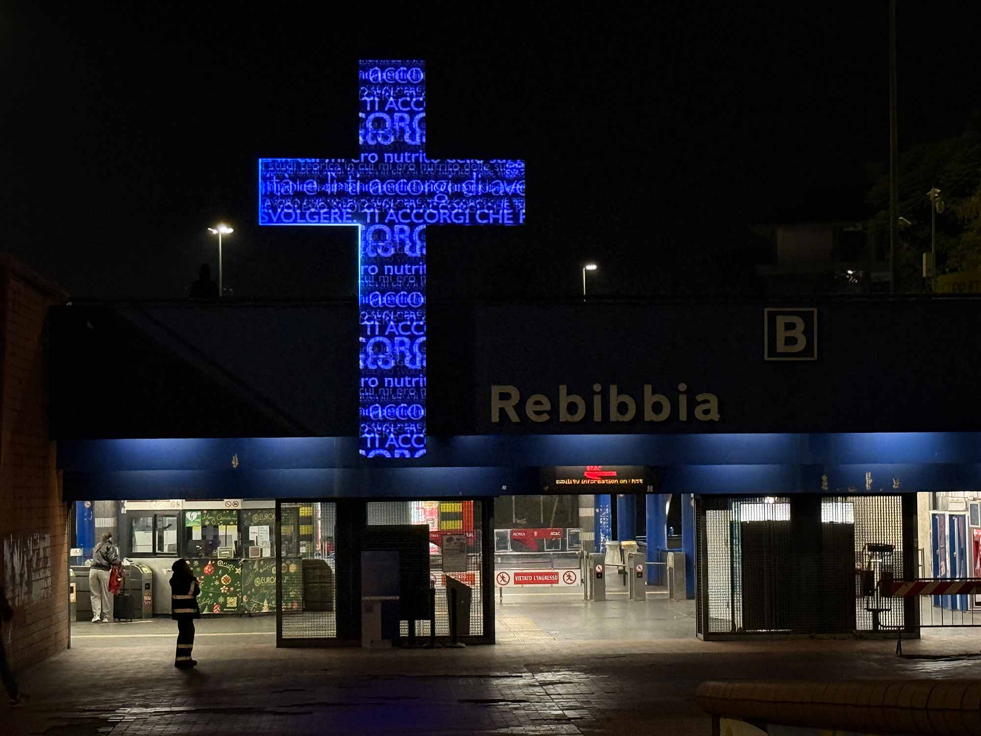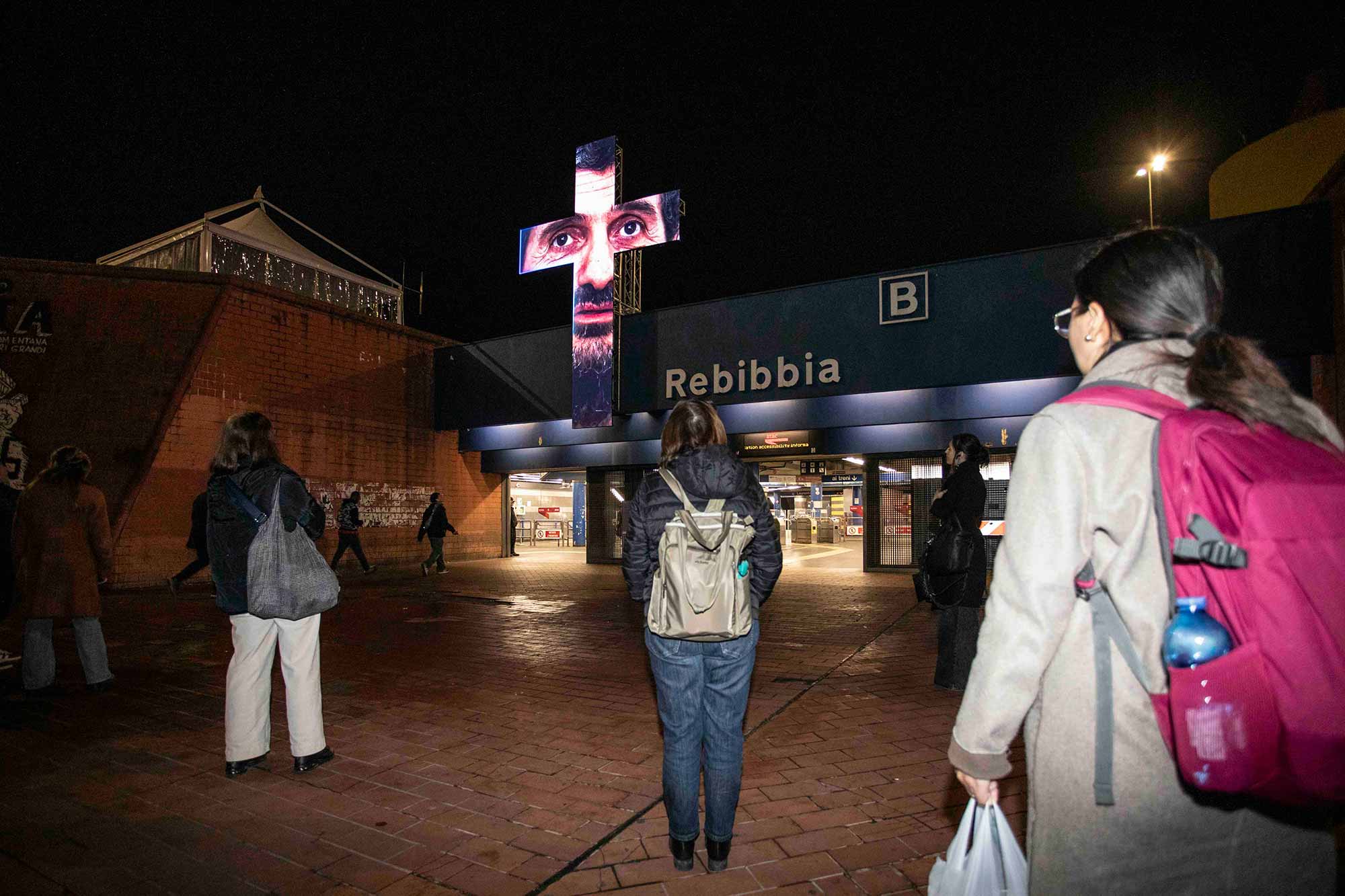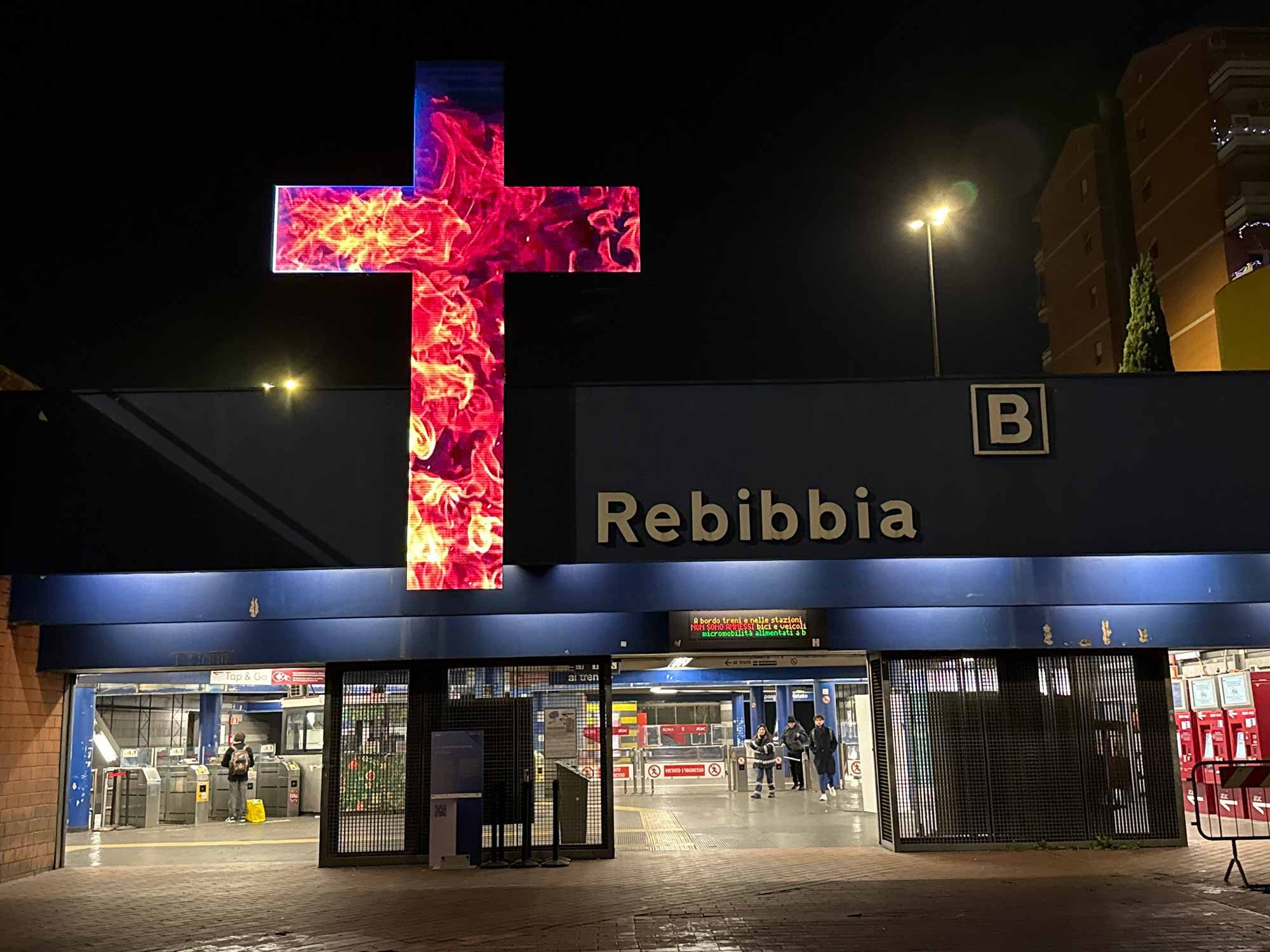 Il cuore del progetto è l’allestimento della grande installazione audiovisiva a forma di croce firmata dall’artista Angelo Bonello e prodotta da Artificio Italiano: alta sei metri sarà collocata simbolicamente all’esterno della stazione della Metro Rebibbia, punto di confine tra città e istituzione penitenziaria.