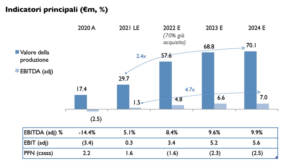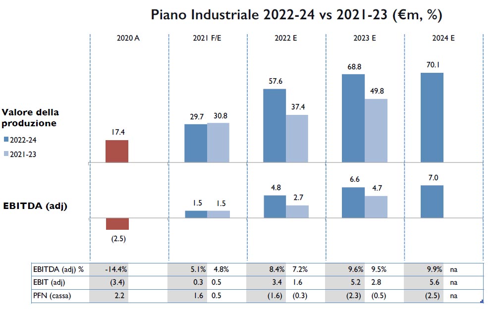 I principali punti del Piano Industriale 2022-2024 sono i seguenti: si prevede un Valore della Produzione che nel 2022 raggiunge, per crescita interna ed esterna, un valore di Euro 57,6 milioni in incremento anche rispetto agli esercizi precedenti pre-Covid per poi crescere progressivamente fino a Euro 70,1 milioni nel 2024, portando l’EBITDA Adjusted da Euro 4,8 milioni a Euro 7 milioni e, in percentuale sui ricavi, da 8,4% nell’esercizio 2022 a 9,9% nell’esercizio 2024. La posizione finanziaria netta, pari nel 2021 a Euro 1,6 milioni, diventa positiva per Euro (1,6) milioni nel 2022 fino ad Euro (2,5) milioni nel 2024.