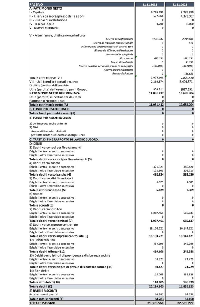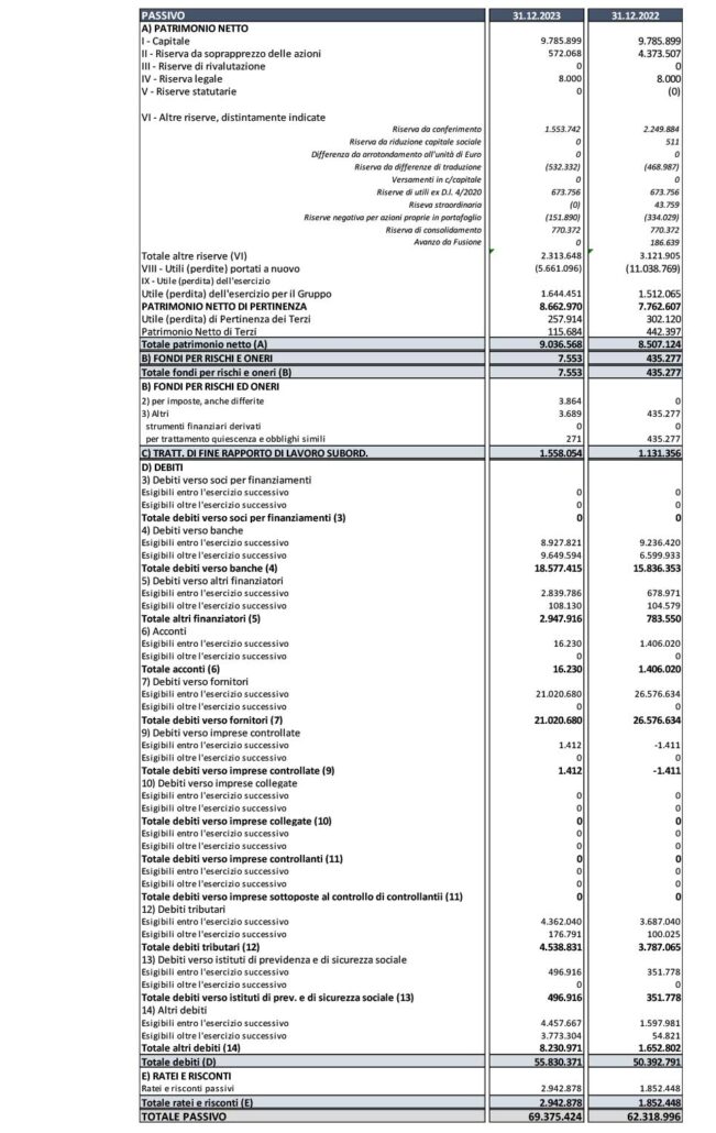 Il Patrimonio Netto è pari a Euro 9,0 milioni, in incremento del 6 % rispetto al 2022 (Euro 8,5 milioni). Questo risultato dipende principalmente dal risultato dell’esercizio.