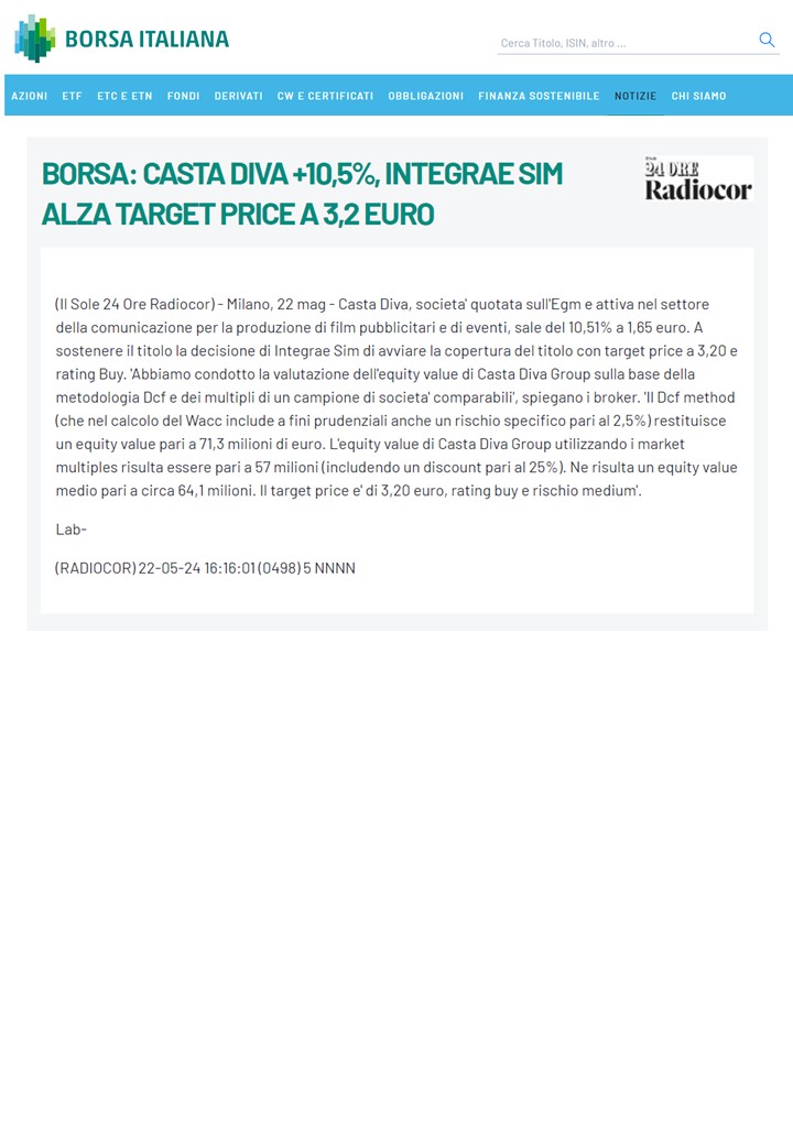 Borsa: Casta DIva +10,5%, Integrae Sim alza target price a 3,2 euro