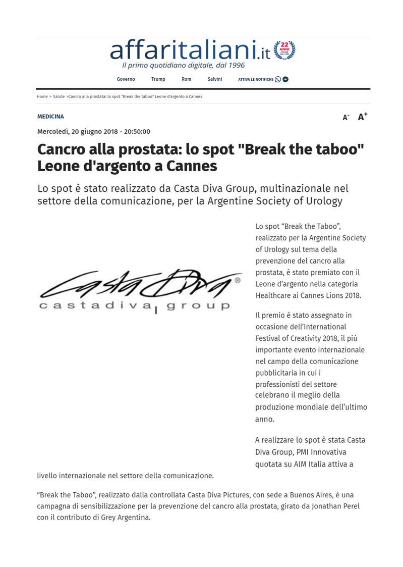 Cancro alla prostata: lo spot “Break the Taboo” Leone d’argento a Cannes