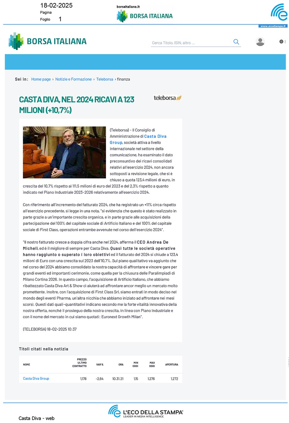 Casta Diva, nel 2024 ricavi a 123 milioni (+10,7%)