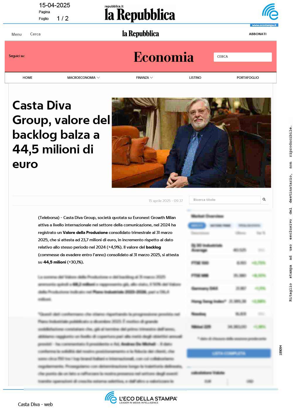 Casta Diva Group, valore del backlog balza a 44,5 milioni di euro