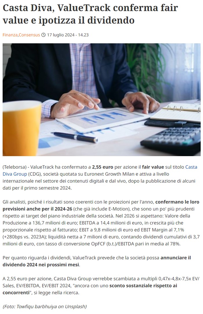 Casta Diva, ValueTrack conferma fair value e ipotizza il dividendo